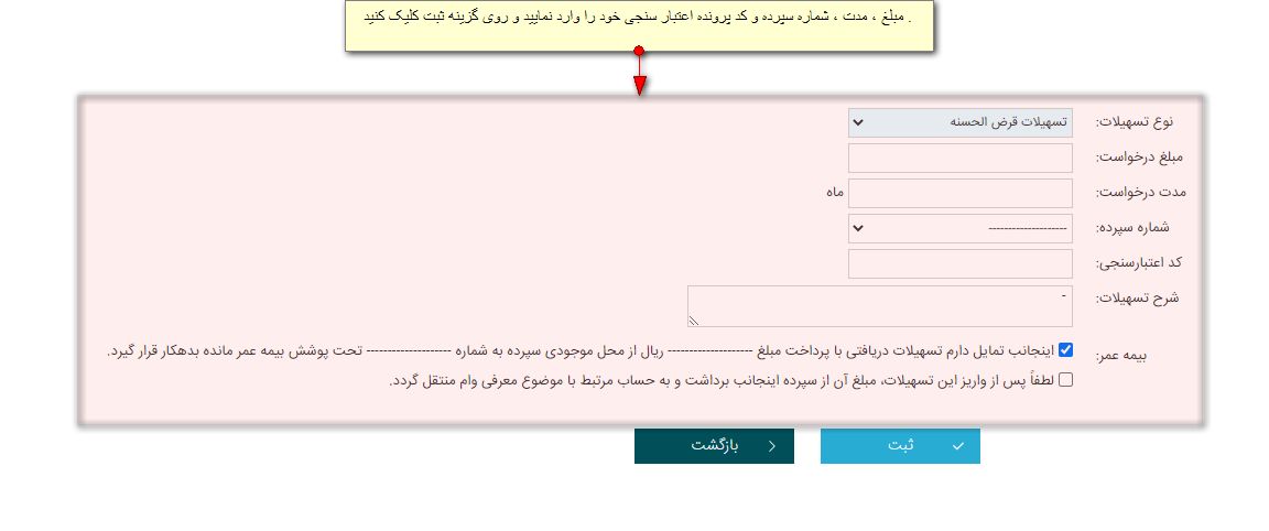 مبلغ ، مدت ، شماره سپرده و کد پرونده اعتبار سنجی  خود را وارد نمایید و روی گزینه ثبت کلیک کنید .
