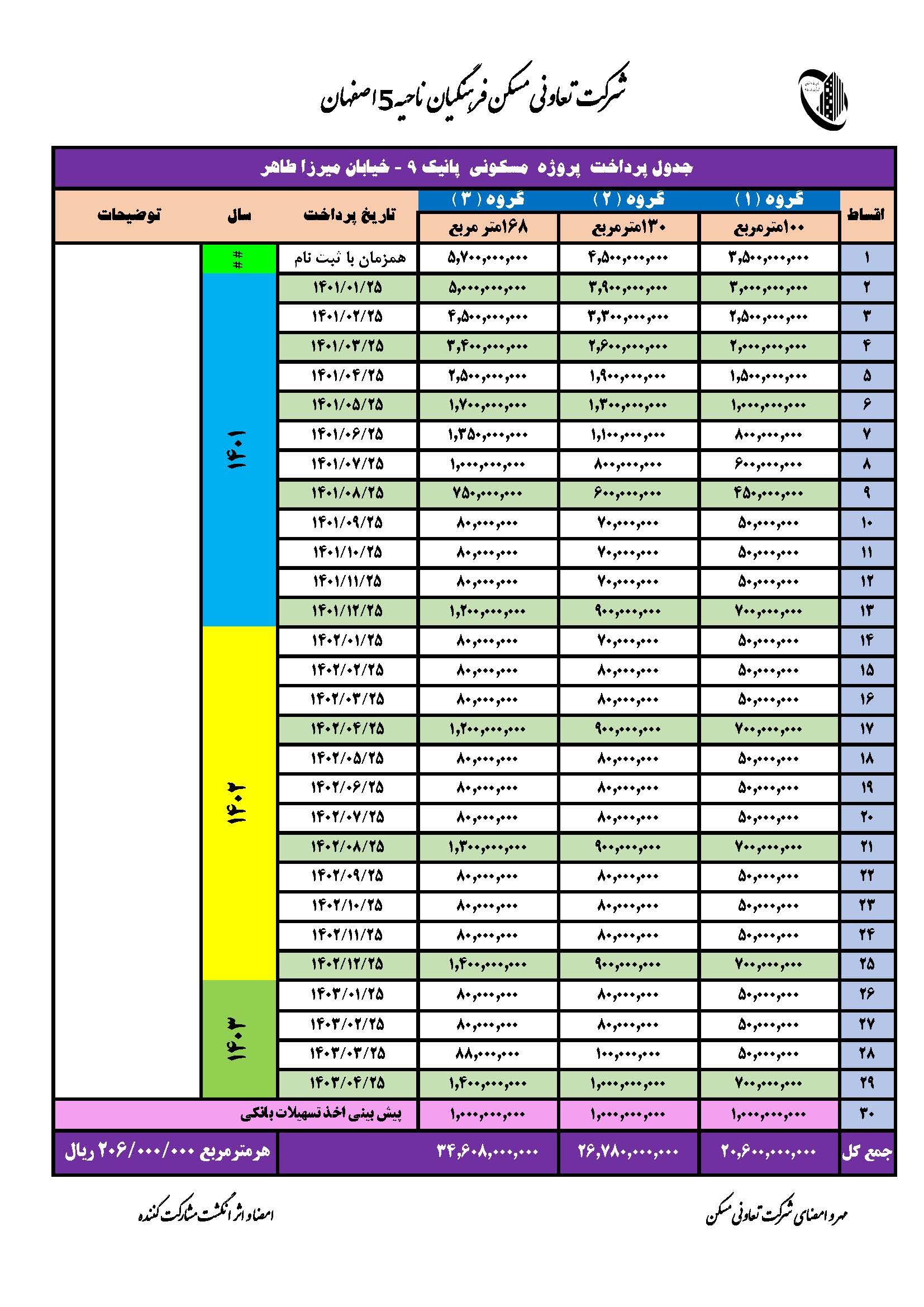 ·         با توجه به اینکه متراژ  واحدهای مسکونی پروژه از 74 مترمربع تا 185 مترمربع میباشد ثبت نام اعضا در گروه ( 1 ) با میانگین 100 مترمربع - گروه ( 2 ) با میانگین 130 مترمربع و گروه ( 3 ) با میانگین 168 مترمربع صورت می پذیرد